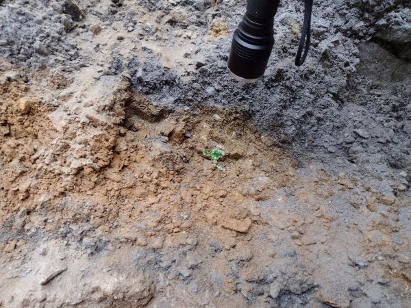 V neděli jsme se nejprve vypravili lokalitu Damětice u Horažďovic. Největší odval po bývalé uranové těžbě tvoří v lese asi 100 metrů dlouhý hřbítek, v čele odtěžený. V jedné ze stěn jsem udělal vertikální rýhu a s pomocí UVA baterky identifikoval vrstvu s výskytem uranových minerálů. Uranové minerály se zde vyskytovaly výhradně ve vrstvě rezavé barvy, v odkryvu cca 4 metry dlouhé, ale pouze 5 až 20 cm vysoké. Zřejmě jde téměř výhradně o uranocircit, z většiny jen rozptýlený v hlinitém materiálu v podobě zrn do 1 mm. Z výchozu se nám podařilo získat několik kusů rozpukané křemenné žiloviny s uranocircitem, s plochými krystalky do velikosti 5 mm. Další lokalitou byl lom Nihošovice. Tento lom je v současnosti mimo provoz a veškerá forota je odvezena. V lomu se nám nepodařilo najít žádné vzorky se zdejší mineralizací (zejména granáty). Poslední lokalitou byl vrch Betáň u Malenic. Kdysi jsem zde byl na exkurzi se Společností Národního muzea a poté jsem lokalitu znovu již dvakrát marně hledal. Od místního sběratele jsme dostali GPS bod na mapě, ale i tak jsme se prodírali šíleným porostem a mysleli že lokalitu opět nenajdeme. Nakonec se podařilo, její začátek ležel asi 50 metrů od zadaného bodu. Nyní ji tedy konečně máme správně zaměřenou. Lesní balvaniště, ve kterém se nachází zdejší almandiny je povrchově poměrně dost přebráno a nenašli jsme mnoho vzorků. Největší granát našel Luděk, cca 20 mm, jinak se velkost pohybovala nejvýše do centimetru. Pro lepší nálezy by již bylo nutno vyhrabat ze země čerstvý materiál a vyhradit si na to patřičně delší čas.