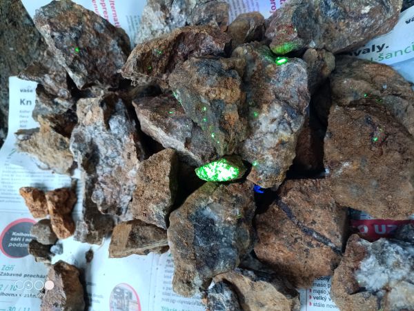Zahájili jsme mineralogickou lokalitou pyromorfitu u vrchu Skalice poblíž Nemojova. Chvíli jsme se marně motali po starém lůmku, kde je dnes skládka posypového materiálu a nějaká hala, až Mirek objevil kopaniště kousek za lůmkem v lese. Přesto že byla vidět novější práce, tak v obnaženém skalním výchozu, ani v čerstvé suti jsme nenašli ani náznak pyromorfitu. Buď byl tedy sběratel velmi důkladný a nic po sobě nenechal, nebo bylo marným jeho snažení. Dokumentační vzorky jsme vyhrabali z okolí ohniště o dva metry níže, tj. v suti ze starších prací. Další zastávkou byla haldička po průzkumné těžbě Malý Bor – Vrbík. Nejprve to vypadalo, že remízek je tvořen spíše navážkou stavební suti, ale poměrně rychle jsme s UVC baterkami našli vzorky se scheelitem. Jsou tam i celkem velké kameny hustě prorostlé scheelitem, velmi tvrdé na rozbíjení, ale i za dne bylo snadné je pomocí UVC baterek identifikovat. Vzhledem k váze scheelitové rudniny jsme odnášeli dost zatěžkané tašky. Pokračovali jsme na lokalitu Stohlavec. Lesní výkopy tam jsou všechny zřetelně staršího data, žádné nové práce a na povrchu ani žádný dokumentační vzorek. Na poli poblíž jsme našli několik vzorků dutin s krystaly křemene až světlého ametyst, spíše dokumentační kvality. Sebral jsem i pár kusů křemeno-hematitové brekcie, zkusím říznout a vyleštit, co z toho bude. Dále jsme se jeli podívat na starý lůmek Na Hrádku, u Horažďovic. Křemenné žíly jsou tam intenzivně těženy a musí to tedy být pěkná dřina. Ve stěně jsme však neviděli žádné perspektivní místo a ani suť neposkytla vzorky které by stály za sebrání. Poslední sobotní lokalitou byl lůmek na vrchu Hora u Velkých Hydčic. Lůmek je aplanován, zahrnutý zeminou a není tam žádný skalní výchoz, jde tedy nyní již o zaniklou lokalitu.