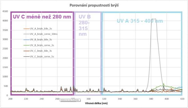 Brýle mají vynikající filtrační parametry (UVA – oranžová, UVB – modrá, UVC – hnědá křivka):