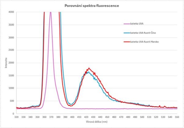 Graf měření luminiscence ukazuje, že odraz UV záření od vzorku minerálu, 368 nm výrazně převyšuje samotnou luminiscenci fluoritů, s maximem v 419-424 nm: