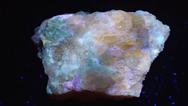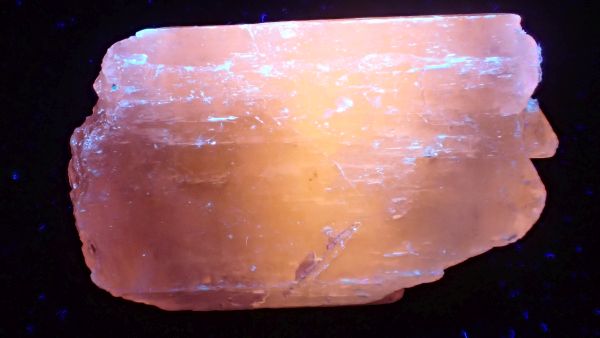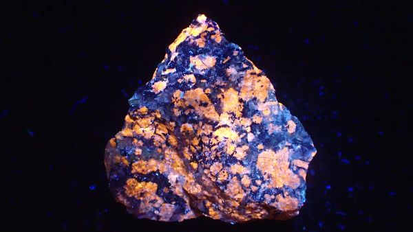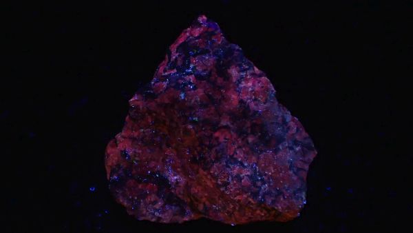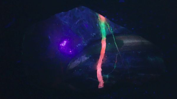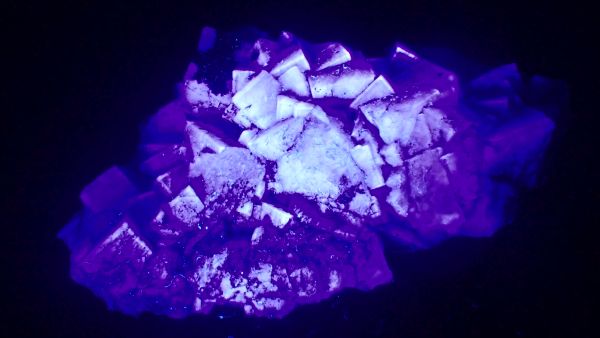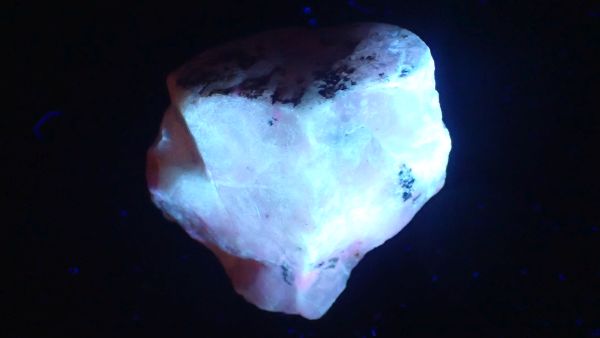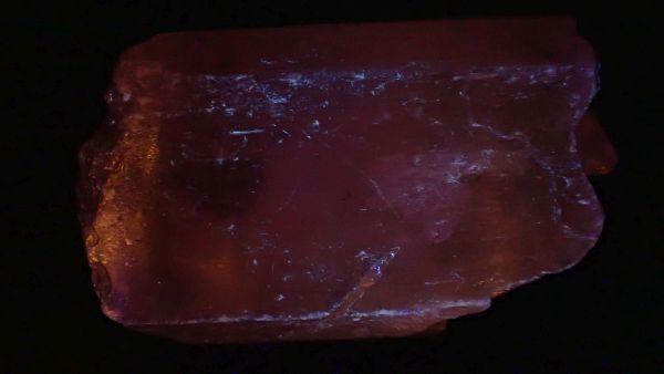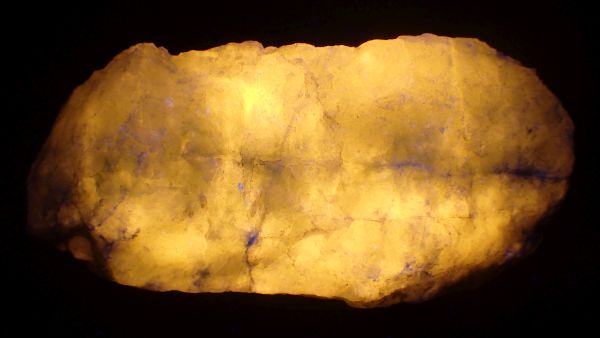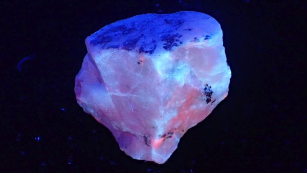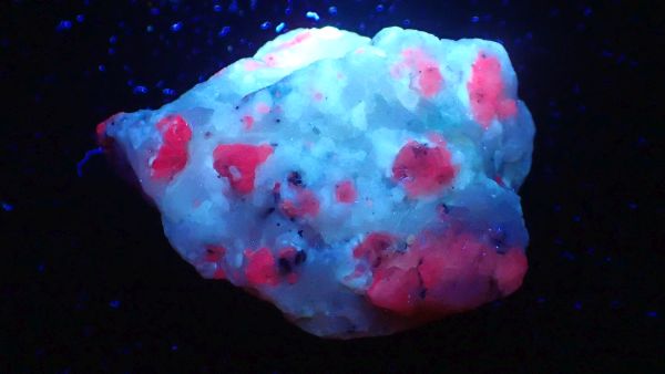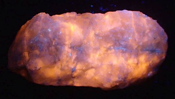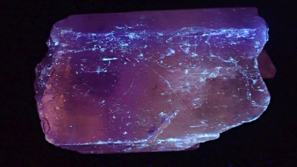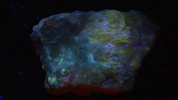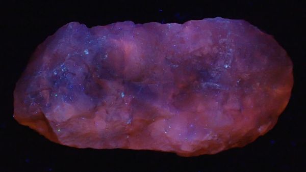 (tento svítí oranžově v UVA, v UVB prakticky nereaguje, v UVC výrazně červeně; tenebrescence je u tohoto vzorku poměrně malá)