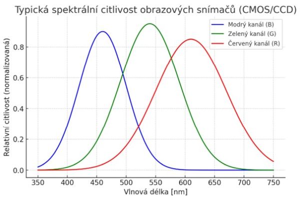 Modrý kanál (B) má maximum citlivosti kolem 450–470 nm, přičemž směrem k ultrafialové oblasti (pod 400 nm) rychle klesá.