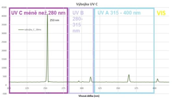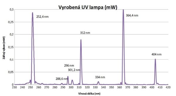 V grafu je patrné, že „píky“ UV záření jsou nejen v deklarovaném a žádoucím UVC (252 nm), ale dokonce ještě výraznější v délce 364 nm (tedy v nevhodném – příliš dlouhém UVA) a dále menší „píky“ ve 312 nm (delší UVB) a 404 nm (tj. u samé hranice nejdelšího UVA vedle viditelného fialového záření). Z tohoto důvodu pod touto „UVC“ lampou mohou pozorovatelně svítit i minerály jinak reagující pouze na UVA nebo UVB. U výbojek bývá výraznější solarizace (degradace) UV křemenného filtru vlivem používání lampy. Pod „novou“ lampou tedy bude pozorovatelný vyšší efekt UV luminiscence než pod lampou starší (resp. více používanou). UV výbojky mají určitou dobu, než nabydou plného výkonu, takže nejsou vhodné na krátké „posvícení“. Než plně naběhnou, může trvat až několik minut. Výbojkám také nesvědčí časté vypínání a zapínání, zkracuje se jejich životnost. Jejich pořizovací cena je však zpravidla výrazně nižší než u UV LED diod (zejména než u UVC LED diod). Výbojky se dnes dají sehnat nejen na síťové napájení 230 V, ale i nízkonapěťové, například na 10–12 V. Uvádí u ní dokonce dvě varianty, standardních 254 nm, nebo ultrakrátkých 185 nm, zde ani netuším, co a jak by pod tak krátkou vlnovou délkou svítilo. Také je třeba vzít v úvahu, že při vlnové délce 185 nm již bude vznikat ozón a je třeba tedy být opatrný a případně větrat.