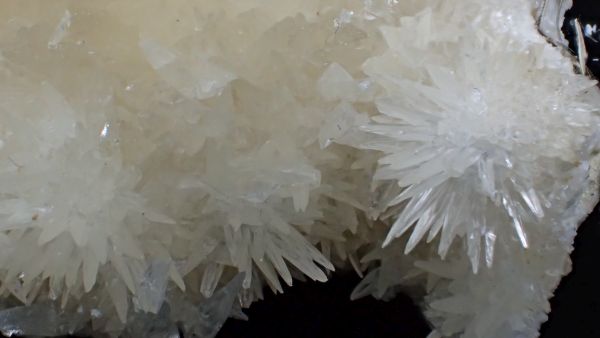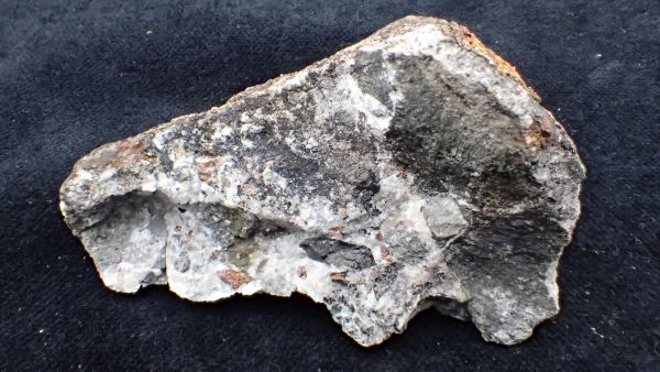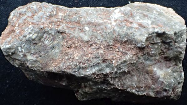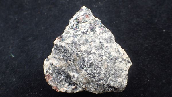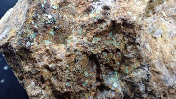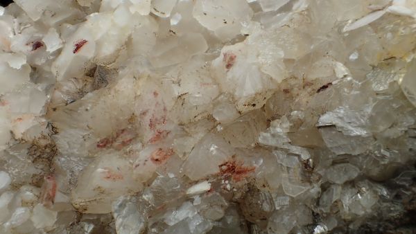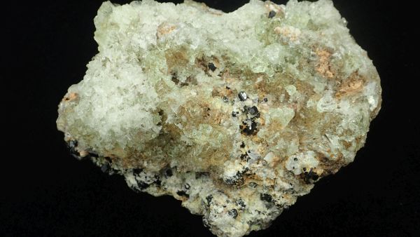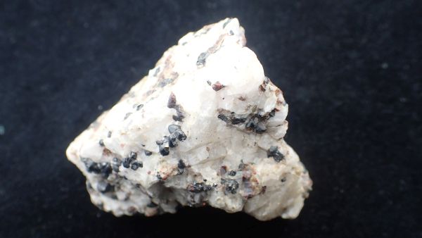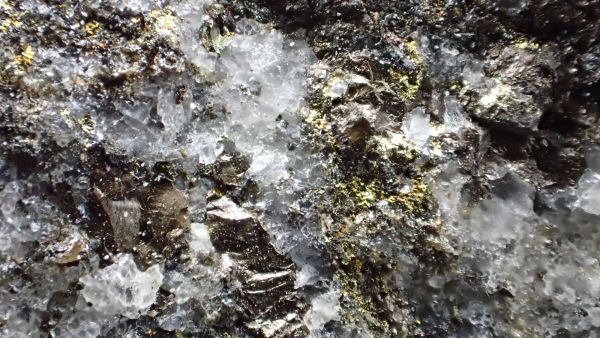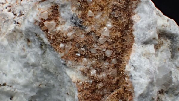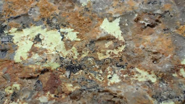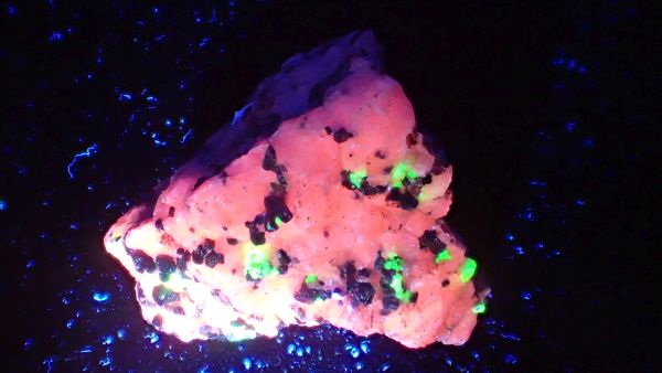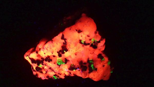 (černá zrna jsou franklinit, hnědá zrna jsou zinkit, bílý matrix tvoří jednak kalcit – žlutooranžová až červená luminiscence a willemit – zelená luminiscence; willemit z této lokality svítí v UVA/B/C)