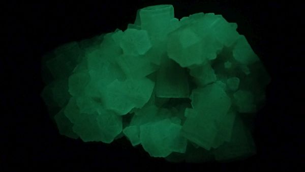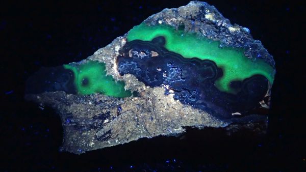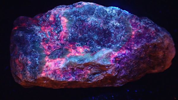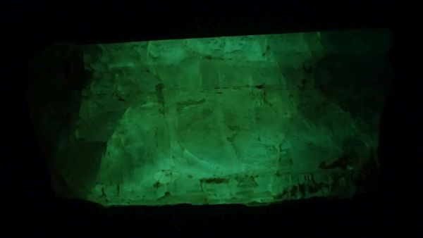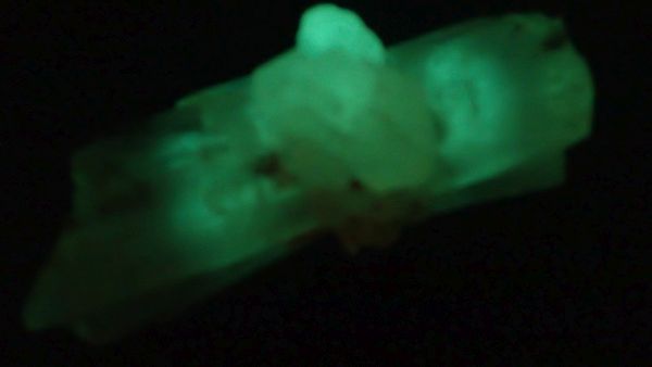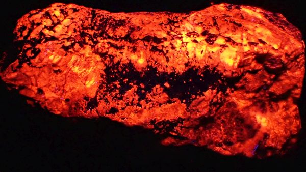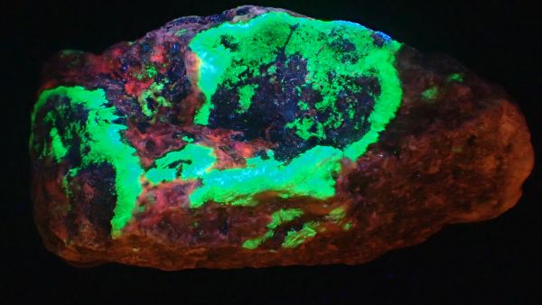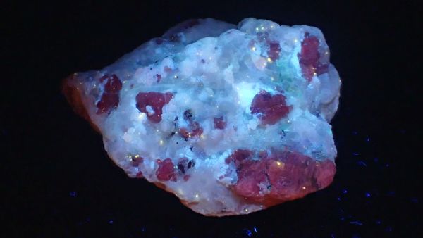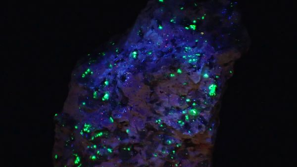 (v UVA nesvítí nic, v UVB svítí červeně kalcit, teprve v UVC se ukáže zeleně svítící willemit, společně s červeným kalcitem)
