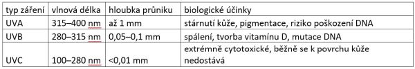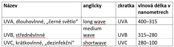 Základní dělení UV záření je na UVA, UVB a UVC: