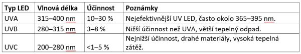 (Pozn.: Pokud je udáván příkon 5 W, je efektivní UVA světelný výkon cca 0,5–1,5 W – viz tabulka „Účinnost a tepelné záření“.)